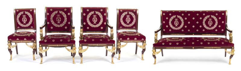 comprised of two side chairs, two armchairs and one settee, having gilt metal mounts throughout with square upholstered backs with armrests supported by sphinxes, raised atop two griffin form legs at the front and splayed legs at the back.