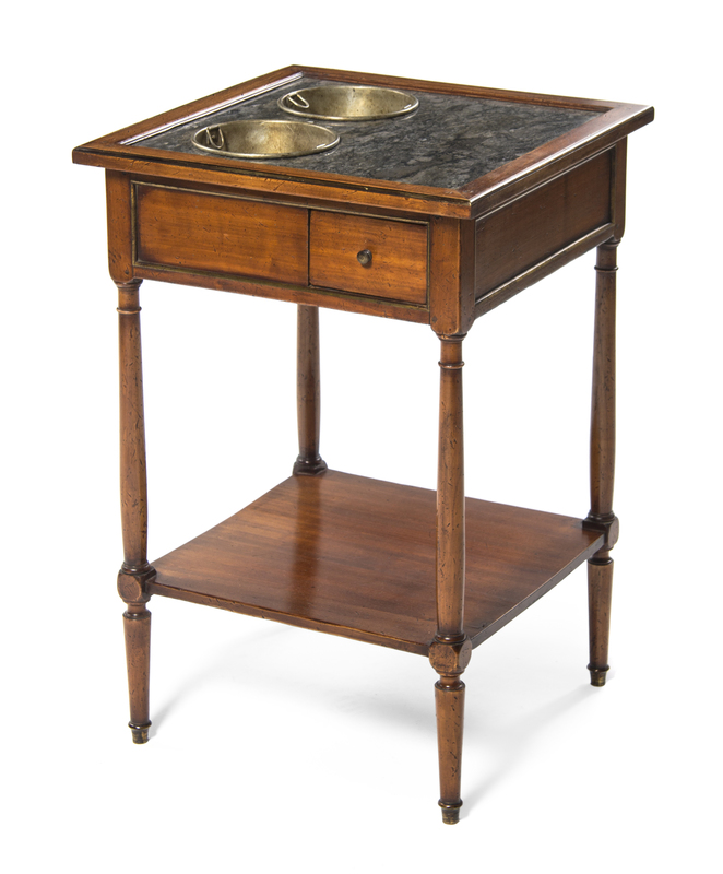 having a square marble inset top fitted with two buckets above a single drawer, raised on tapering legs joined by a medial shelf.