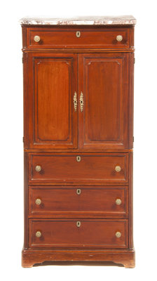 having a rectangular marble top with rounded corners above a frieze drawer, over two panel doors opening to four pullout shelves, further set with three drawers, raised on a plinth base.
