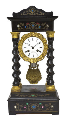 A Napoleon III Style Ebonized and Brass Inlaid Portico Clock, P. Marti et Cie,