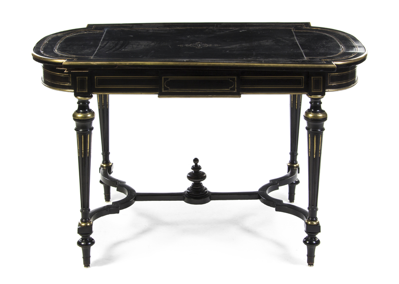 A Napoleon III Ebonized and Brass Inset Table a Milieu,