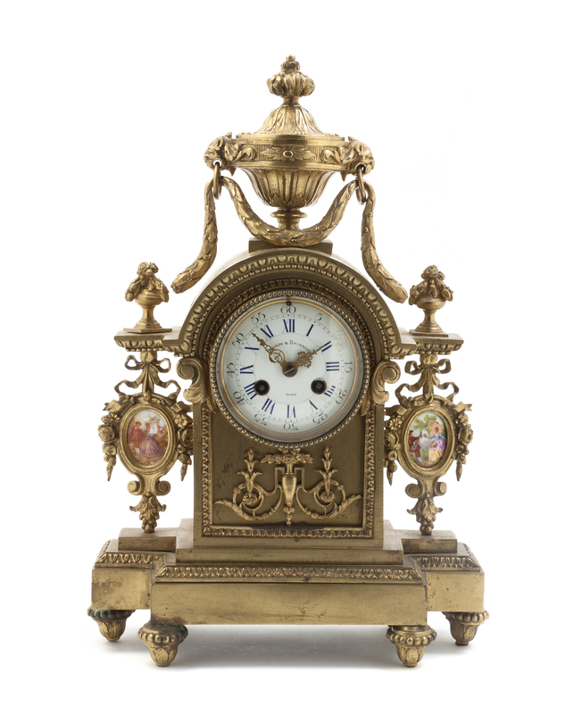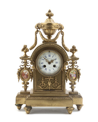 A French Gilt Bronze and Porcelain Inset Mantel Clock,