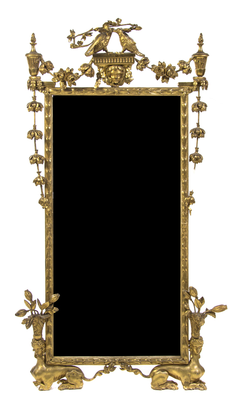 18th century, the rectangular frame carved with dogs, swags, sphinxes and urns issuing flowers, set with a conforming later plate.