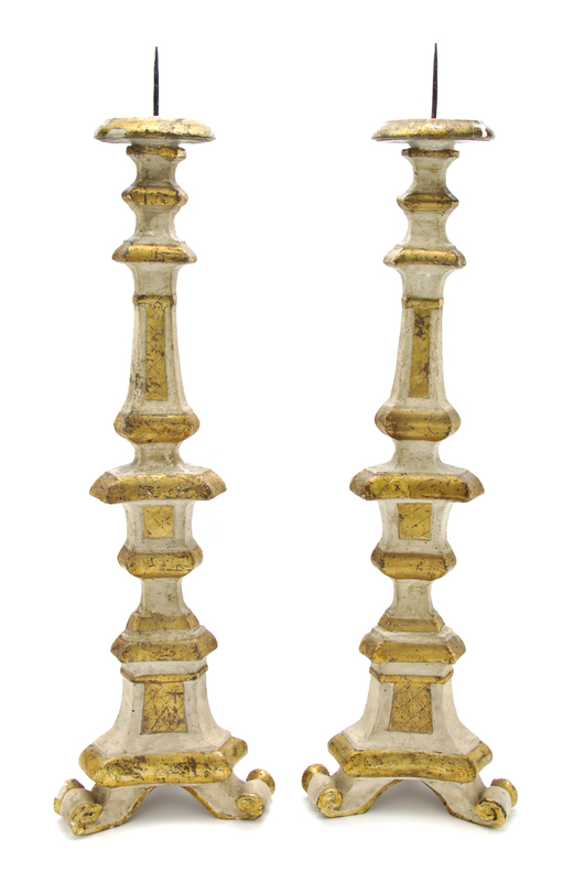 A Pair of Italian Carved, Painted and Parcel Giltwood Pricket Sticks,