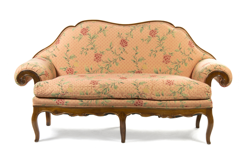 having a curved crest rail over the upholstered back and seat within everted arms above a shaped apron, raised on cabriole legs.