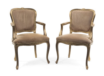 modern, each having a foliate carved crest over the upholstered back, arms and seat, raised on cabriole legs.