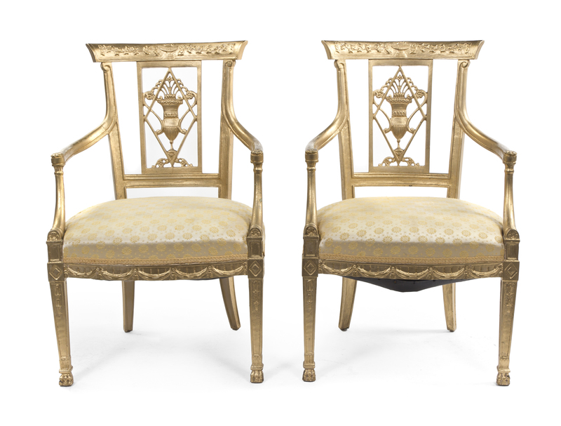 each having an urn decorated crest and splat over the upholstered seat, raised on square tapering legs.