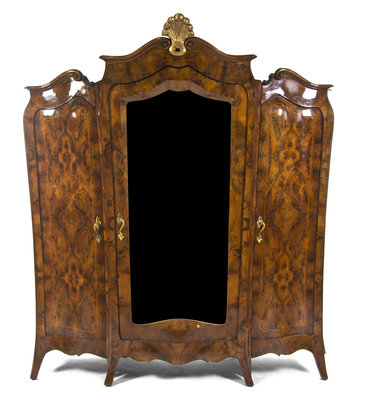 in three sections, the central section with a gilt shell crest over the mirror inset door, flanked by smaller bombe side cabinets, each with handled doors having marquetry decoration, raised on slightly splayed legs.