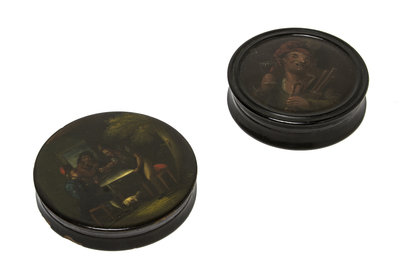 Two Continental Lacquered Papier Mache Snuff Boxes,
