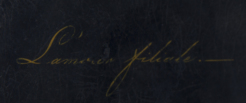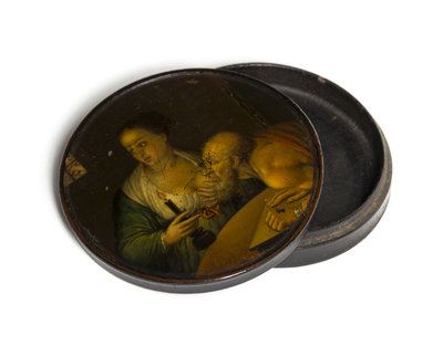 of circular form, the lid painted with a scene after Roman Charity of Pero aiding her father Cimon, the interior inscribed L'amour Filiale, further inscribed Lt: & Fils.