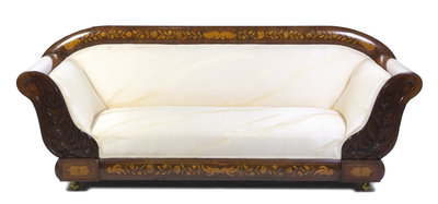 having an upholstered back, arms and seat within foliate and swan carved outswept arms, with foliate inlays throughout.