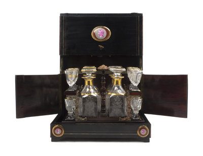 A Continental Brass Inlaid and Porcelain Mounted Cave a Liqueur,
