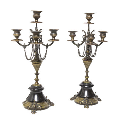 each with a repeating baluster standard issuing the C-scroll candle arms hung with chains, raised on socle bases and set on paw feet.