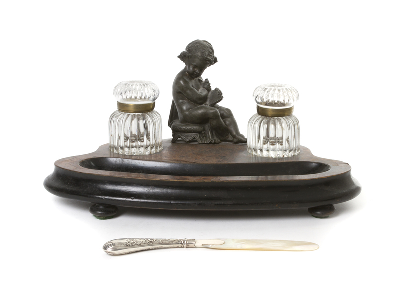 centered with a seated putto flanked by twin ink pots, together with an associated mother-of-pearl letter knife.
