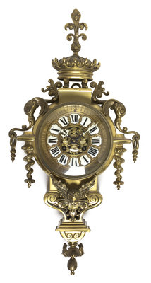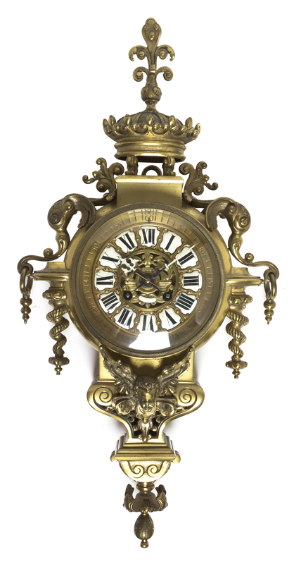 having a stylized crown finial flanked by dolphin form supports above the segmented enamel dial with Roman hours and Arabic minutes, the case further set with ring handles and winged putti masks, having time and strike movement, stamped 3483.