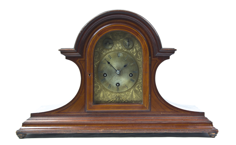 the domed case with stringing decoration throughout, having a brass face with etched scrolling foliate decoration and an applied palmette, set with a circular dial having Roman numerals with German time and strike movement.