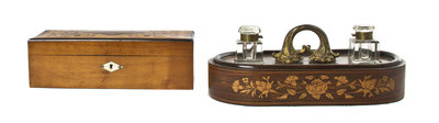 having two ink pots, centered with a foliate cast handle, together with an associated marquetry decorated box.
