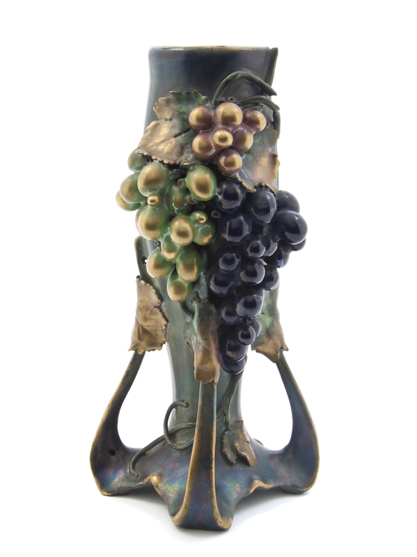 of organic form decorated with grape clusters, raised on an open quadripartite base, impressed with standard marks, further numbered 3581 and 58.