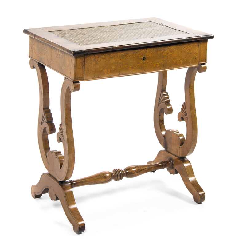 having a rectangular paper inset top above a single drawer with ribbon-tied foliate decoration, raised on twin open supports joined by a turned stretcher.