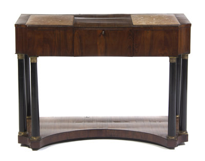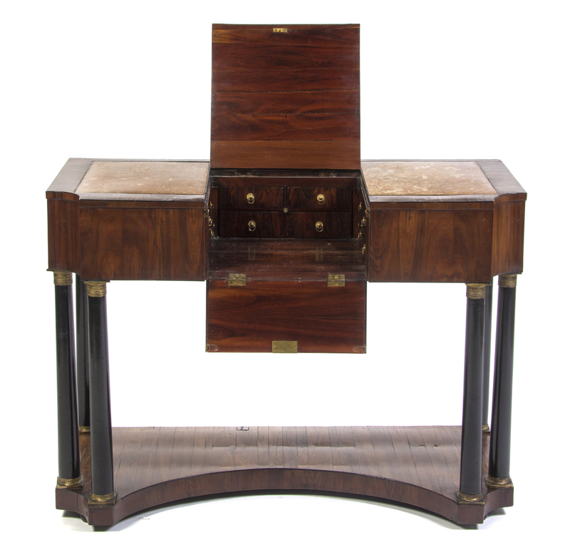 the rectangular marble inset top with rounded corners and a central lift panel opening to a fitted interior, raised on a series of six gilt metal mounted ebonized columnar supports over the concave base.