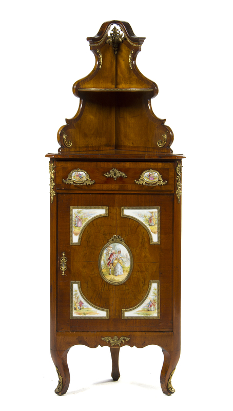 A German Burlwood and Porcelain Mounted Corner Cabinet,