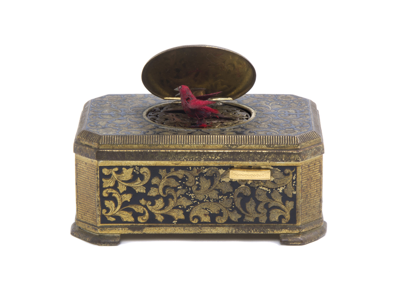 of rectangular form with canted corners and allover scrolling foliate decoration, with a red feathered bird, the mechanism causing the bird to sing, rotate and open his beak, having a bird form key.