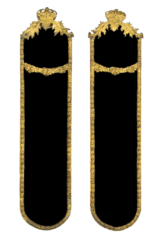 19th century, each of elongated oval form, having a crown and foliate crest above the segmented conforming plate, within a gadrooned border.