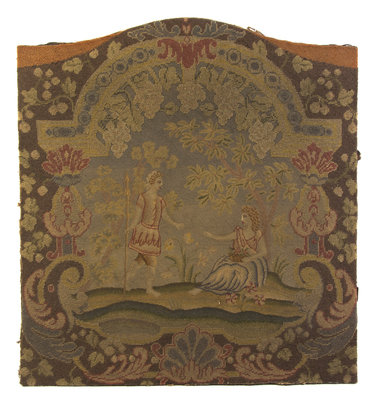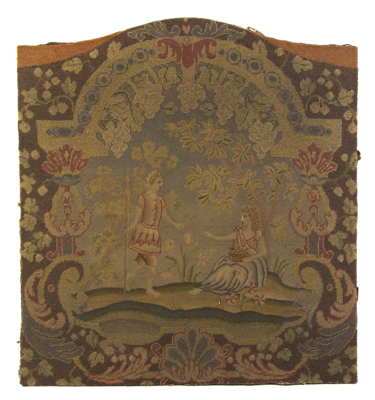 of rectangular form with a shaped top decorated with two figures in a landscape.