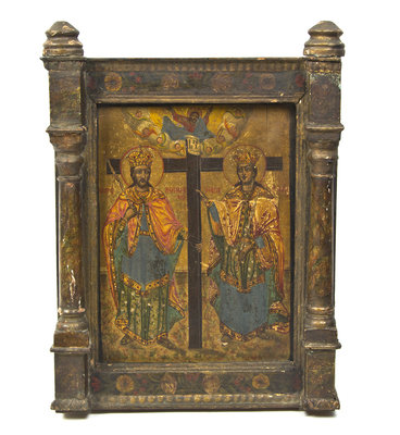 19th century, depicting two saints centered by a crucifix, the frame with two side mounted columnar pilasters having gilt decoration.
