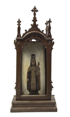 circa 1875, depicting La Virgen del Carmen, retaining the majority of the polychrome decoration, set in a Gothic revival style display case.