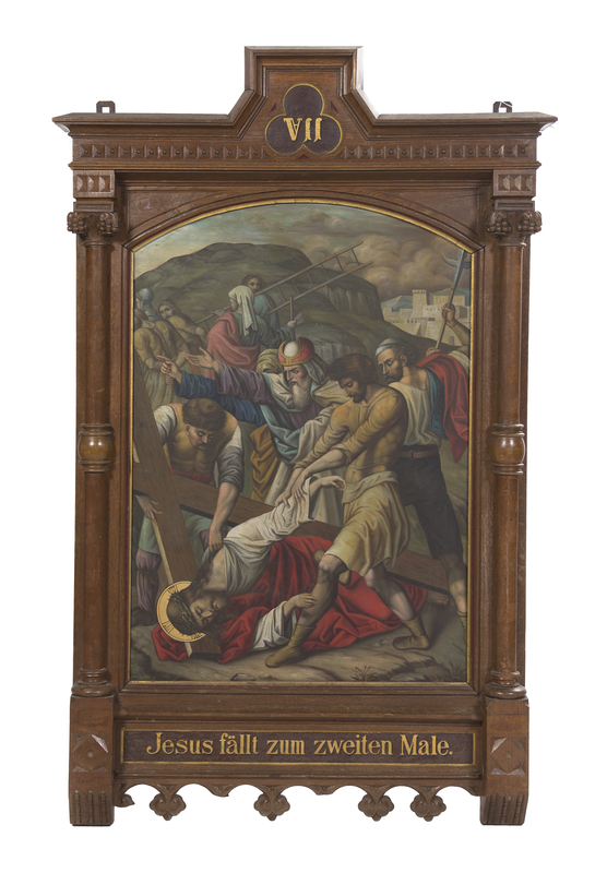 of rectangular arched form, depicting the Crucifixion or the seventh stage of the trial of Christ, set in a carved parcel gilt oak frame, bearing the text Jesus fallt zum zweiten male, translating to Jesus falls for the second time.