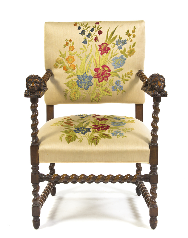 the needlepoint upholstered back and seat set within a barley twist frame, further carved with recumbent lions.