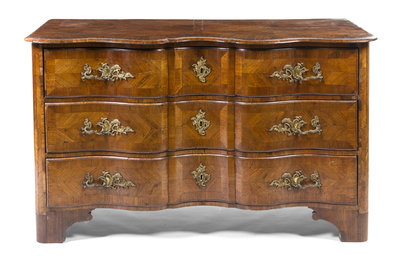mid-18th century, the shaped rectangular top over the conforming case set with three long drawers having foliate cast pulls and escutcheons, raised on bracket feet.