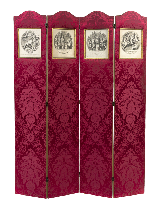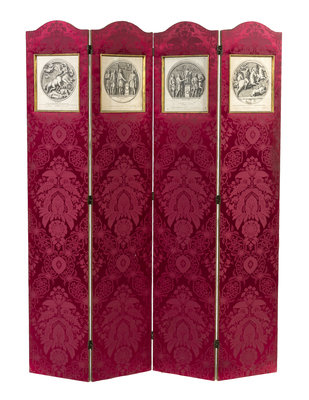 each rectangular upholstered panel with a rounded top, inset with prints depicting Roman mythological scenes.