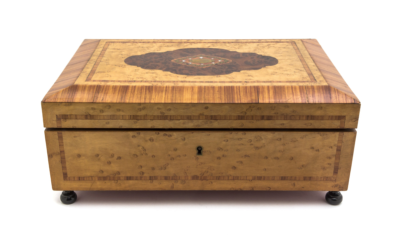 A Continental Mother-of-Pearl and Brass Inlaid Various Woods Musical Dresser Box,