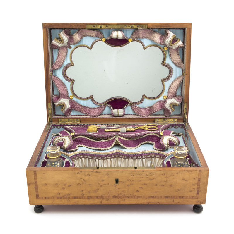 the rectangular hinged top opening to a mirrored fitted interior, set with two bottles and an assortment of gilt metal implements.