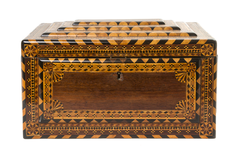 having a rectangular stepped top with geometric decoration, opening to a mirrored interior.