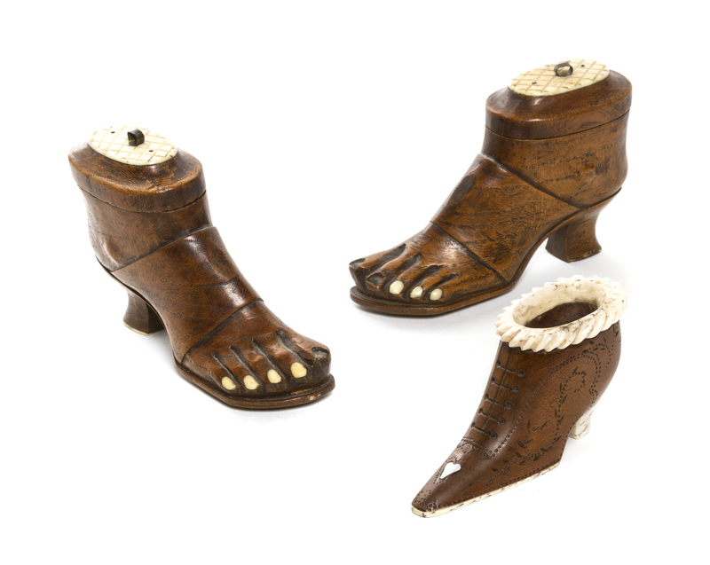 A Pair of Bone Mounted Carved Wood Shoe Form Boxes,