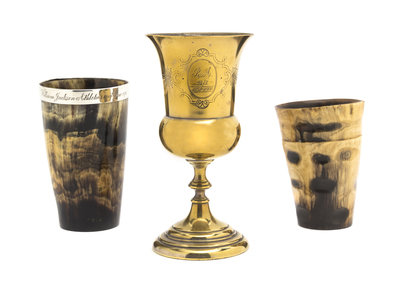 London, marks rubbed, inscribed William Jackson Athletics 500 yards, June, 1870, together with a brass chalice with an incised dedication, dated 1830-1900 and an uninscribed horn tumbler.
