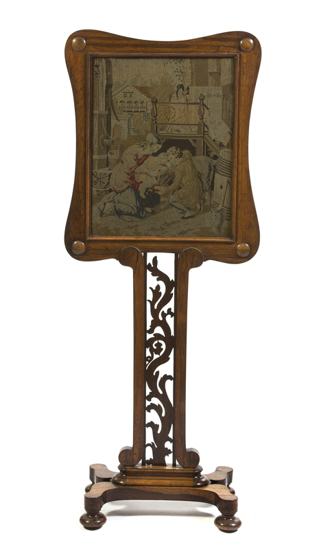 circa 1850, having a vertical rectangular needlework panel depicting figures in an interior, raised on a foliate carved support over four flattened feet.