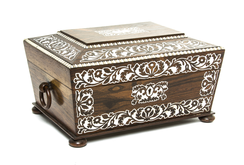 having a rectangular hinged top over the tapering body, set with ring handles with scrolling foliate inlays throughout.