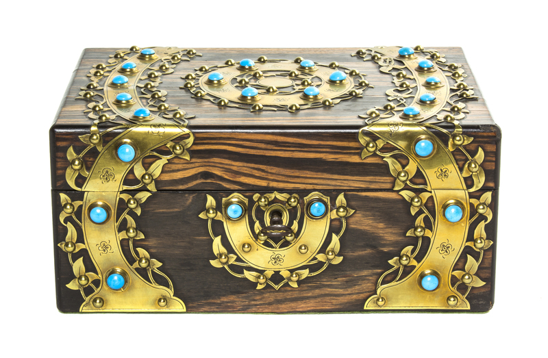 An English Brass Banded and Stone Inset Calamander Wood Table Casket,