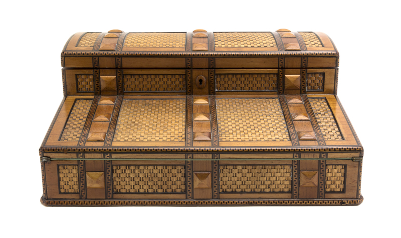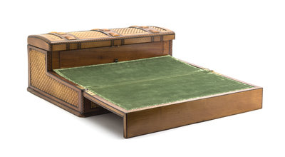 having a hinged top and writing surface, opening to a fitted interior with two ink pots in various compartments.