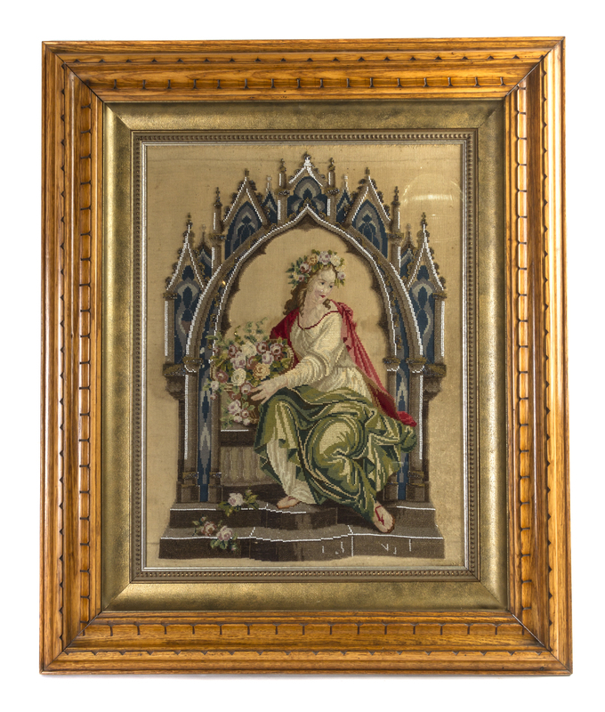 depicting a robed maiden clutching a bundle of roses under a gothic arch.