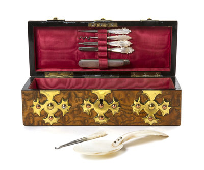 London, set with a collection of mother-of-pearl handled vanity articles, together with an associated abalone spoon and two leather handled implements.