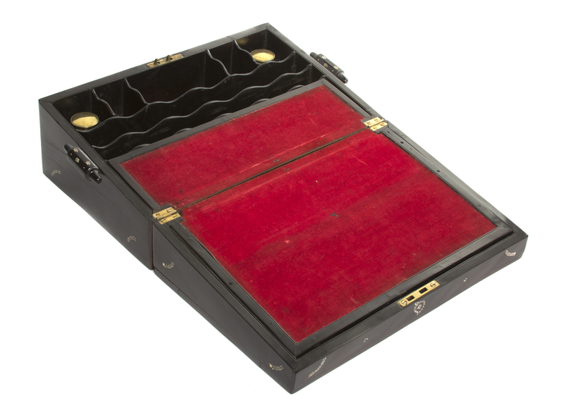 of rectangular form, the exterior decorated with stylized flowers opening to a fitted interior with a velvet lined writing surface and two ink pots.