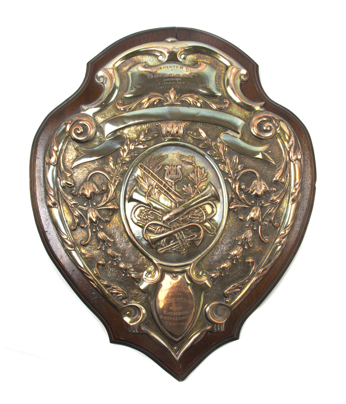 of shield form, centered with a musical trophy dedicated for an orchestra competition set on a conforming wood plaque.
