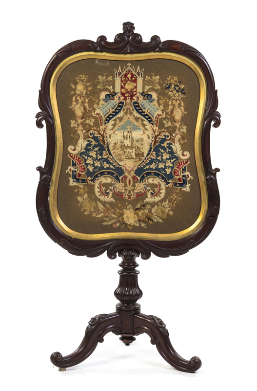 having a needlework picture depicting a tower within a foliate background raised on a tripartite base.