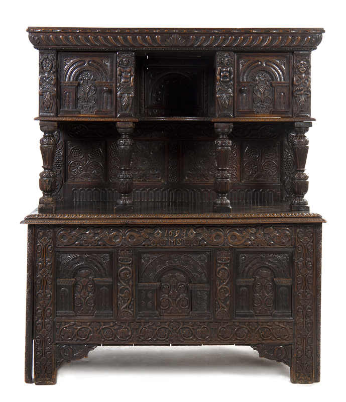 dated 1693, having a gadrooned cornice over a central niche flanked by doors above four pillaster supports and a rectangular top above three doors, raised on bracket feet, the whole with heavily carved floral, scroll and panel decoration.