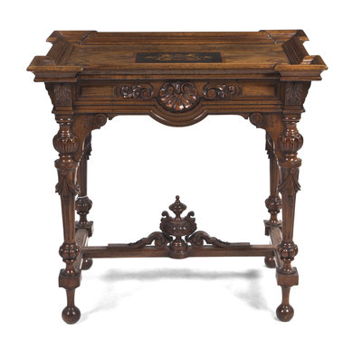 having a rectangular top with turret corners over the carved foliate and shell decorated frieze, raised on fluted tapering columnar legs, joined by a stretcher centered with an urn form finial, ending in spherical feet.